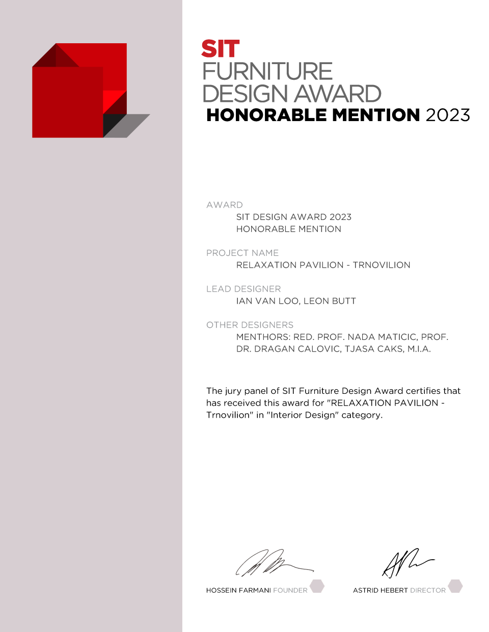 Der Pavillon wurde im Rahmen des New European Bauhaus Programms entwickelt, das nachhaltige, inklusive und ästhetisch inspirierende Räume fördert und europäische Kultur- und Umweltwerte reflektiert. Für seine innovative Verbindung von Komfort, Stil und Nachhaltigkeit wurde das Projekt mit dem Sit Furniture Design Award ausgezeichnet.
